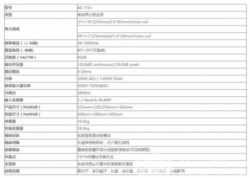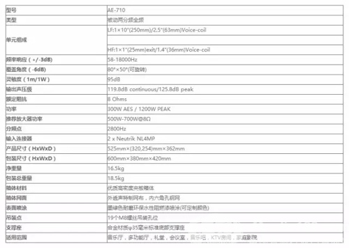 AE系列音箱,是專為頂級娛樂會所、夜總會、高端量販KTV,家庭娛樂KTV等場所擴(kuò)聲打造的音箱系列產(chǎn)品,采用歐洲定制特殊高素質(zhì)材料單元及配件,更有效提高了音樂及話筒的柔順性和穩(wěn)定性;恒指向高音號角可根據(jù)實際使用場所旋轉(zhuǎn),便于在高度有限的空間中貼近天花安裝。箱體有多個M8吊掛點(diǎn),更方便各種方式的安裝和吊掛,箱體合金材質(zhì)φ35毫米標(biāo)準(zhǔn)底部支撐座。箱體選用15mm和18mm的優(yōu)質(zhì)高密度夾板制造,最大程度地減少大動態(tài)狀態(tài)下箱體的諧振,內(nèi)置無源分頻器采用國際頂級的零配件,奠定了產(chǎn)品品質(zhì)的堅實基礎(chǔ),表面采用墨綠色多層水性環(huán)保防水油漆(可定制顏色),后接線板一個瑞士Neutrik NL4MP插座,六角孔鋼網(wǎng)配合特制透聲網(wǎng)布,在保證了聲音的有效傳輸情況下,起到更好的保護(hù)單元作用。