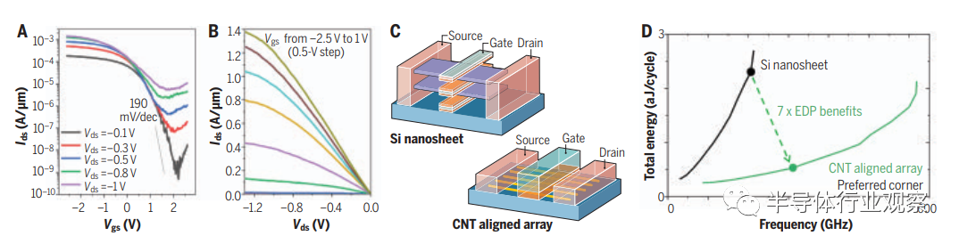 盡管許多應(yīng)用可以從碳納米管的特性中受益,但數(shù)字邏輯應(yīng)用受到了最大的關(guān)注(圖4),因?yàn)樗鼈冇袧摿υ谛阅芎湍茉葱噬铣浆F(xiàn)有的Si技術(shù)。這種典型的高性能器件來(lái)自碳納米管的對(duì)齊陣列,可以在相對(duì)較低的電壓下實(shí)現(xiàn)高的通態(tài)電流(圖4,A到C)。如圖4D所示,在2納米技術(shù)節(jié)點(diǎn)(EDP,或開(kāi)關(guān)能量),與Si納米片相比,摻雜擴(kuò)展和多層高密度碳納米管的門(mén)全能碳納米管晶體管預(yù)計(jì)將顯示多達(dá)7倍的能量延遲積(EDP)效益,是一個(gè)開(kāi)-關(guān)循環(huán)的時(shí)間和功耗的乘積,也是能源效率的衡量標(biāo)準(zhǔn))。正如前面所提到的,由于其超薄的結(jié)構(gòu)(約1nm),碳納米管晶體管即使在柵極長(zhǎng)度上也能提供出色的靜電控制,僅受直接源-漏隧道的限制。寄生電容是影響速度和能量效率的關(guān)鍵因素,占現(xiàn)代硅晶體管總電容的70%。由于其超薄的結(jié)構(gòu),碳納米管晶體管具有非常低的寄生門(mén)源或門(mén)漏電容。CNTs的這兩個(gè)關(guān)鍵屬性,以及高傳輸和注入速度,是高性能、節(jié)能數(shù)字邏輯的物理基礎(chǔ)。